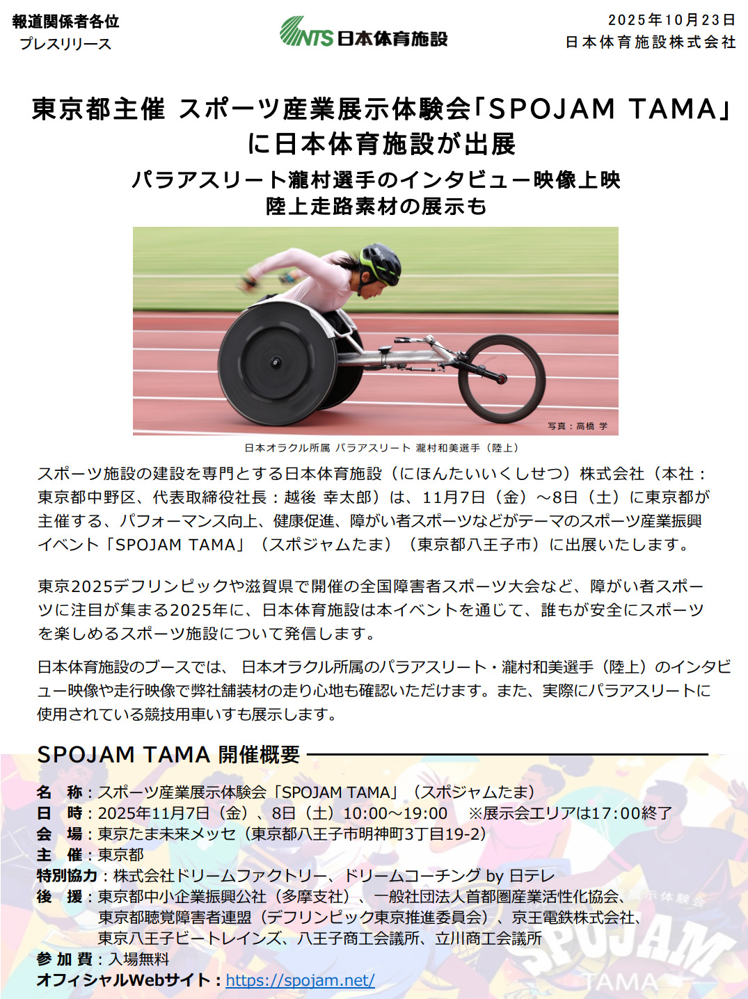 11月7日(金)~8日(土)に東京都が主催する、パフォーマンス向上、健康促進、障がい者スポーツなどがテーマのスポーツ産業振興イベント「SPOJAM TAMA」(スポジャムたま)(東京都八王子市)に出展いたします。