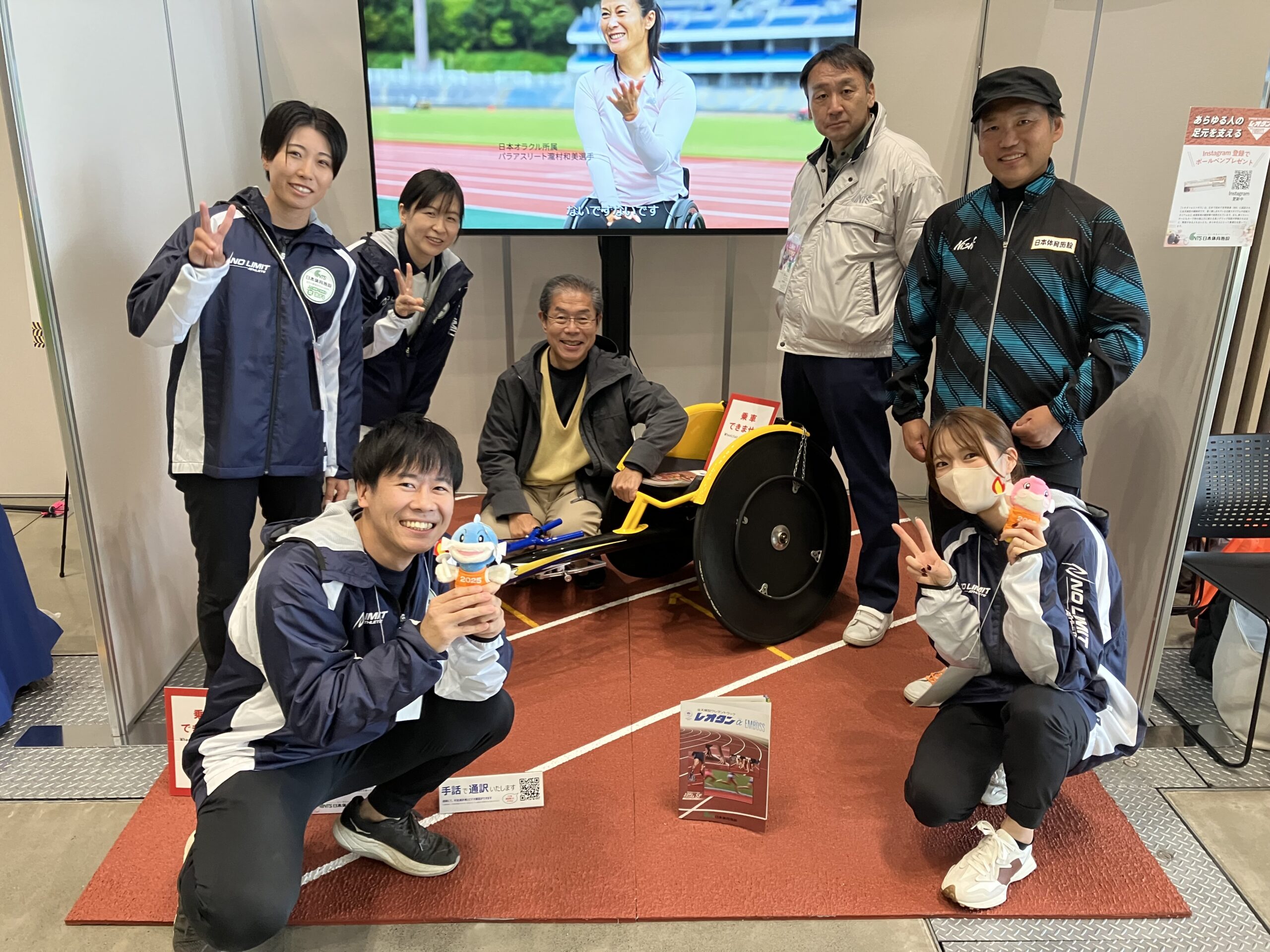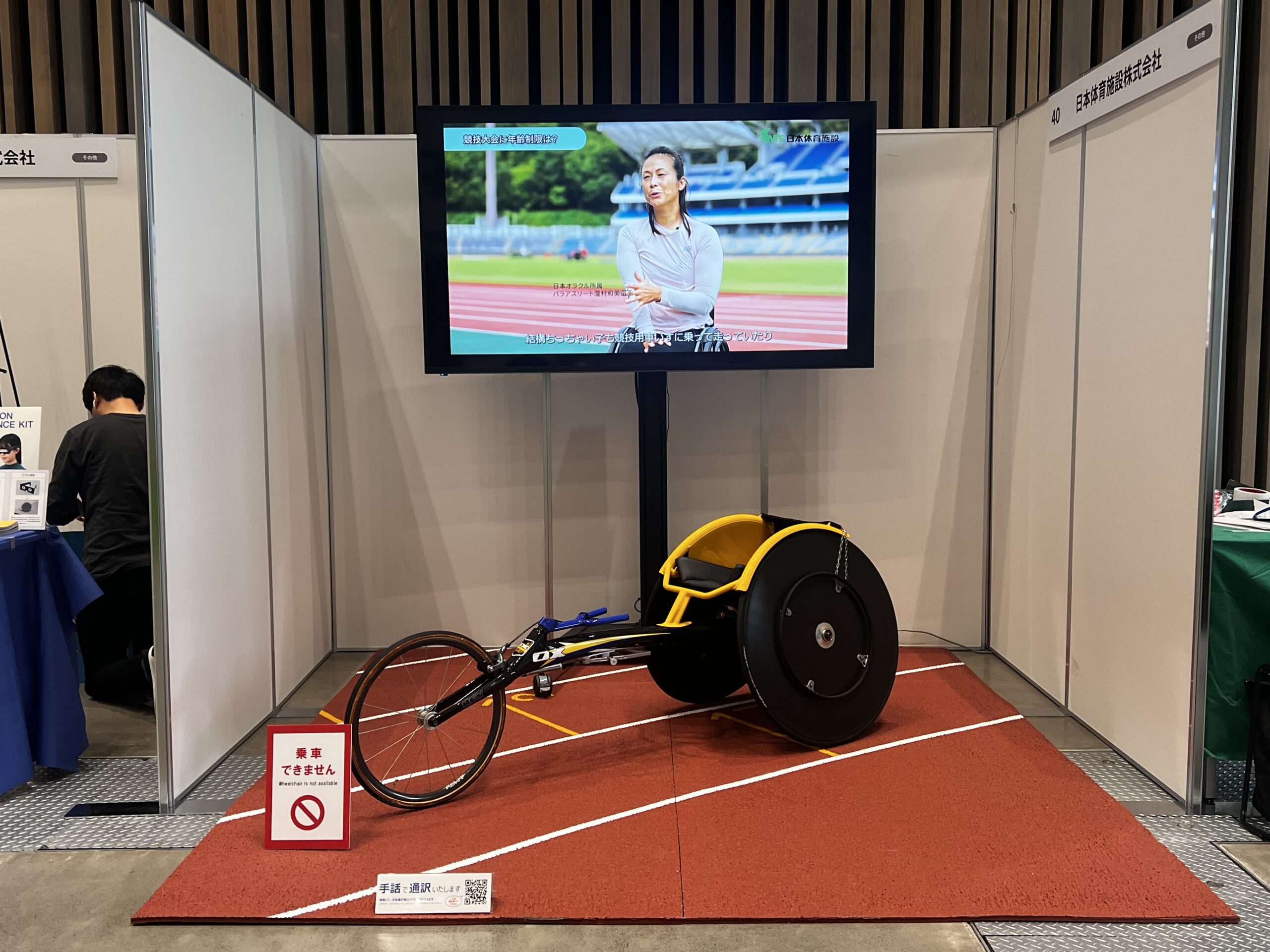 トラックサーフェイス『レオタンαエンボス』と競技用車いすとの関係性を知っていただくため、競技用車いすとウレタン舗装材の展示を行うとともに、パラ陸上アスリート・瀧村和美選手(日本オラクル所属)の走行映像およびインタビュー映像を上映しました。