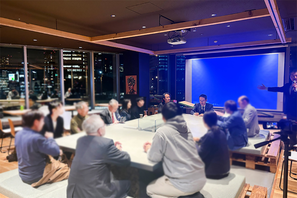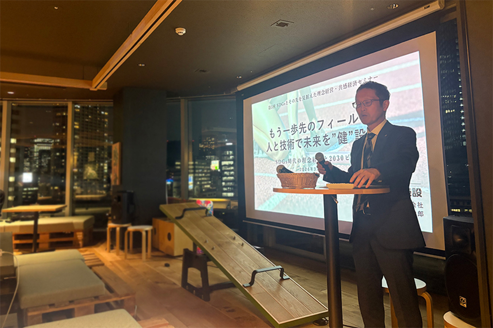 誰もが健康で幸せに過ごせる社会の実現に向けた企業理念や、2030年に向けた中期ヴィジョン「もう一歩先のフィールドへ 人と技術で未来を“健”設する」に込めた想いやヴィジョン策定の背景、そしてスポーツ施設を通じたSDGsの取り組みについて紹介しました。 セミナー後半では、堂目氏をはじめ伊藤武志氏(大阪大学SSI教授 / 万博推進室副室長)、吉條嘉家氏(日本SDGs協会 専務理事)とともに当社代表・越後が参加者と車座形式で意見交換を行いました。参加者からは講演への感想や質問も寄せられました。