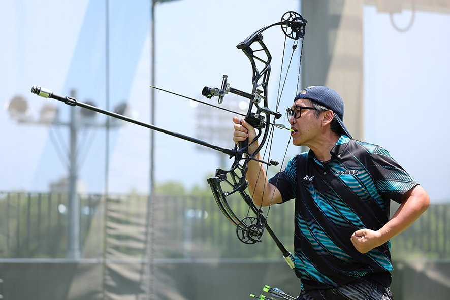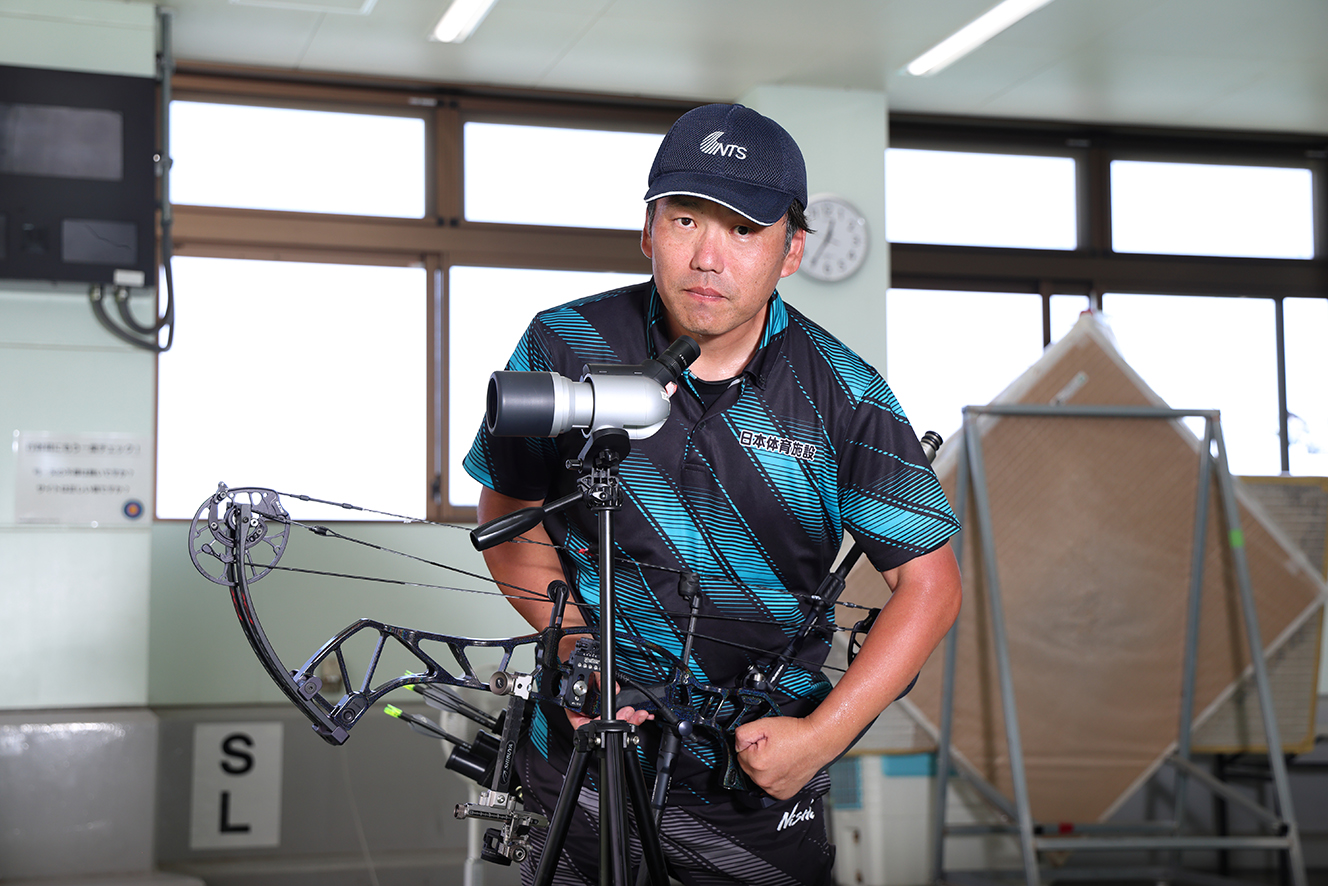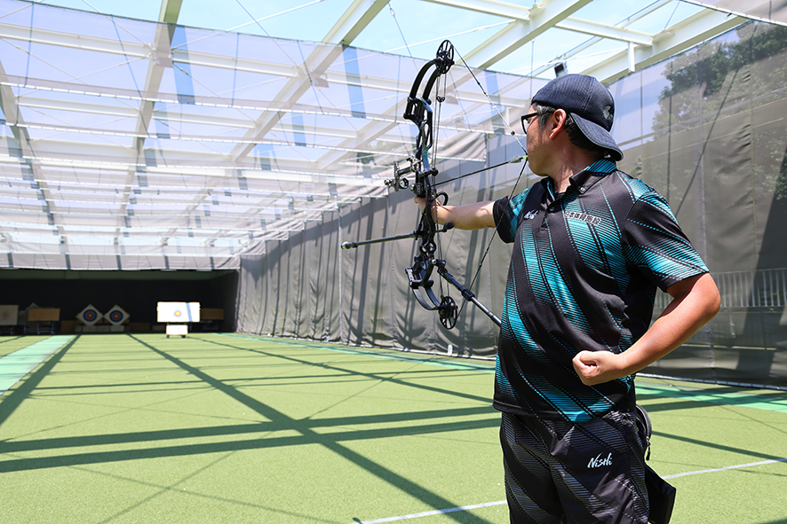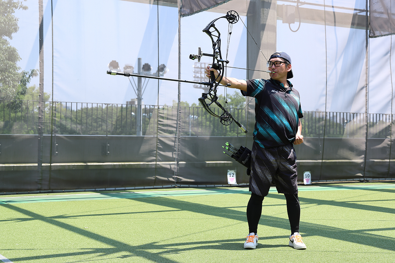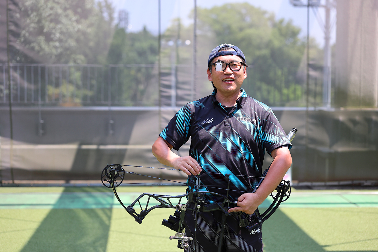 大谷知樹選手は、脳出血による左半身上下肢麻痺の障害を持ちながら、2024年からパラアーチェリーへ挑戦し、全日本実業団アーチェリー競技会準優勝など活躍しています。当社では管理統括本部に所属し、平日の午前中は総務グループの一員として業務を行い、午後から練習に参加しています。